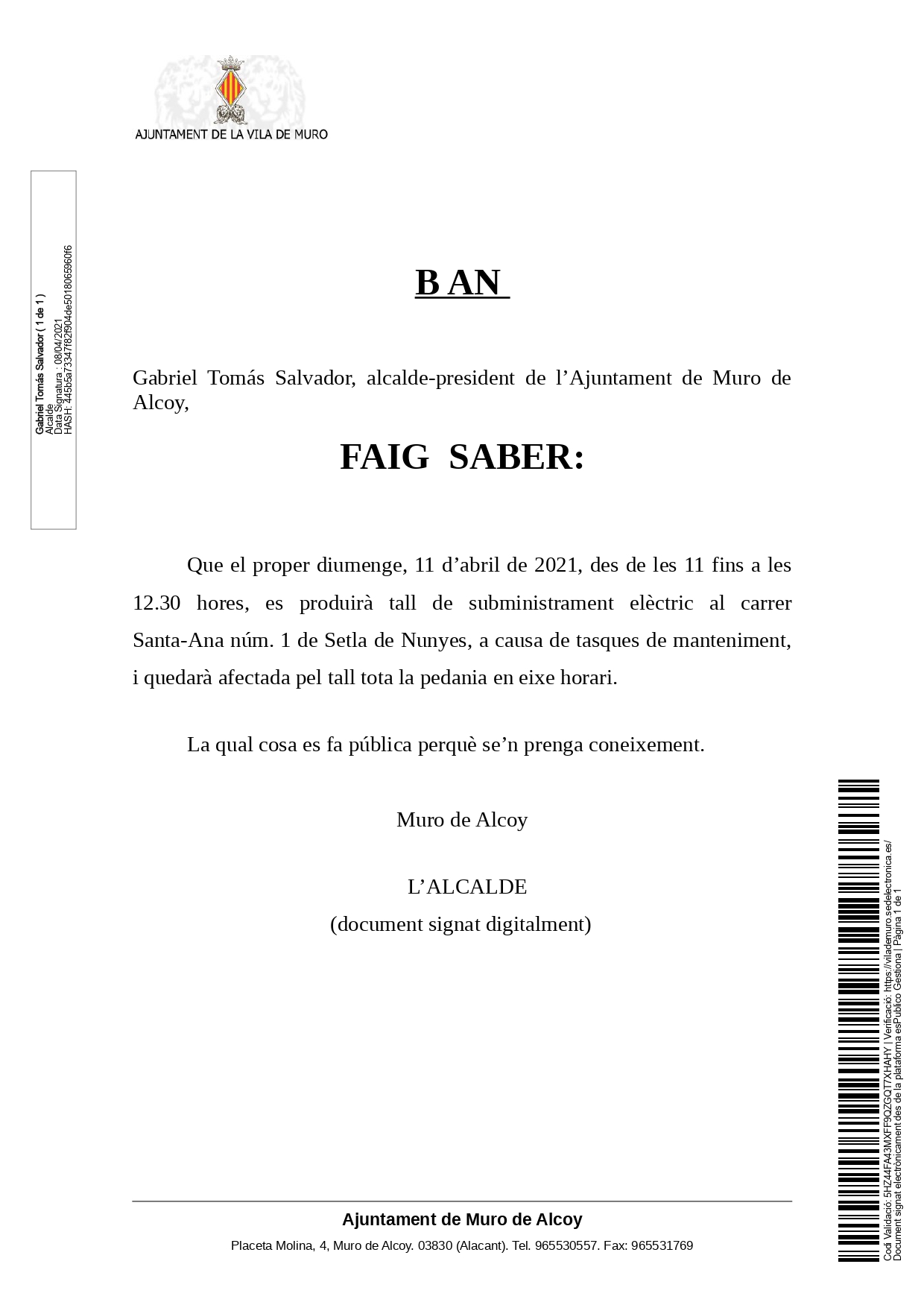 BAN D’ALCALDIA: Tall subministrament elèctric que afectarà a la pedania de Setla.