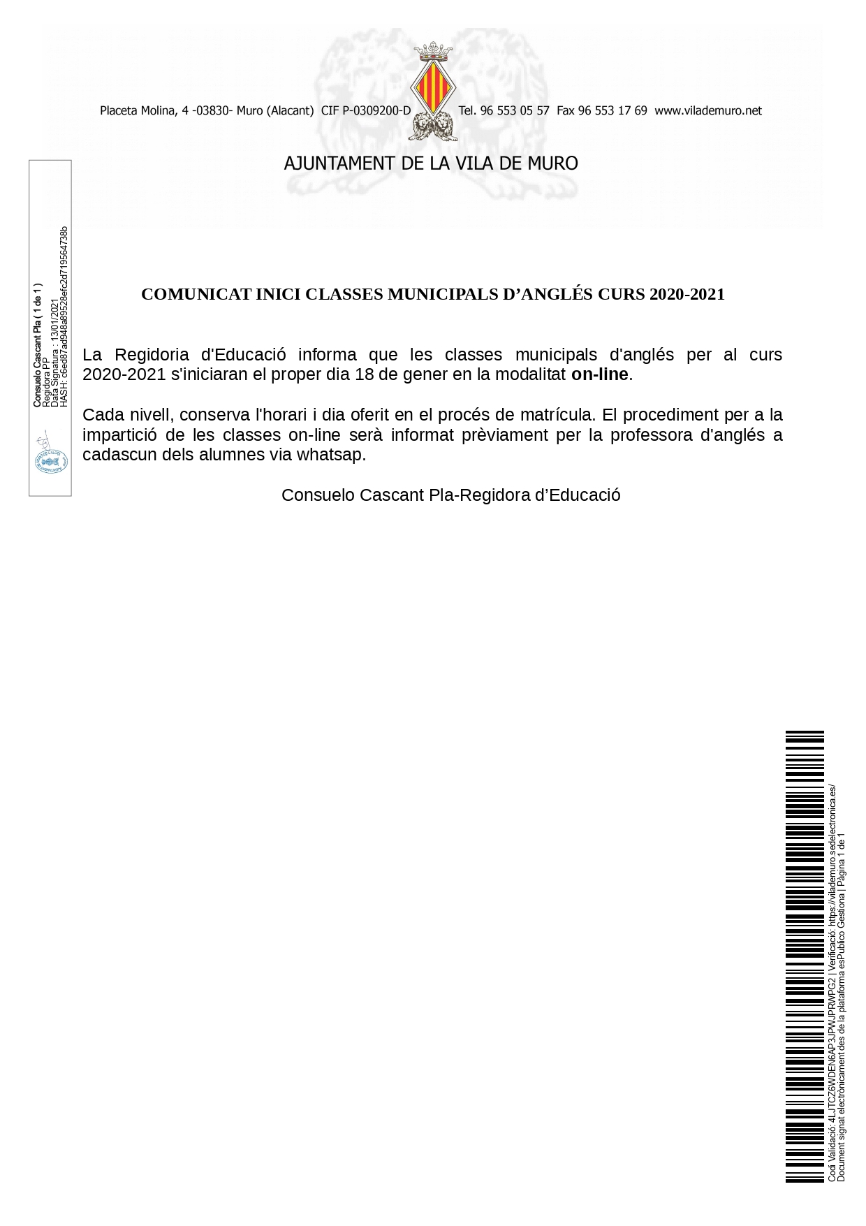 COMUNICAT INICI CLASSES MUNICIPALS D’ANGLÉS CURS 2020-2021