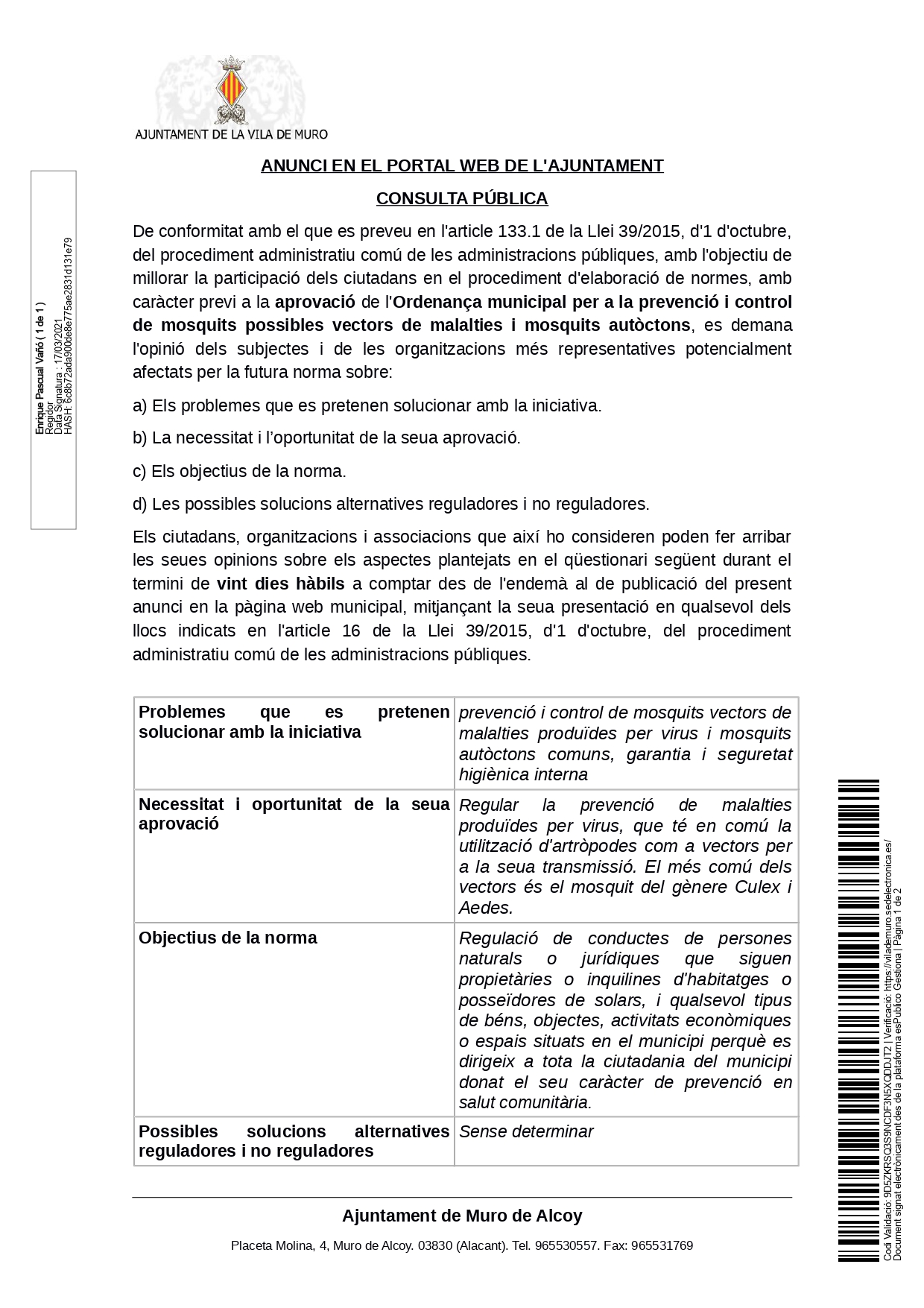 CONSULTA PÚBLICA: Ordenança municipal per a la prevenció i control de mosquits possibles vectors de malalties i mosquits autòctons