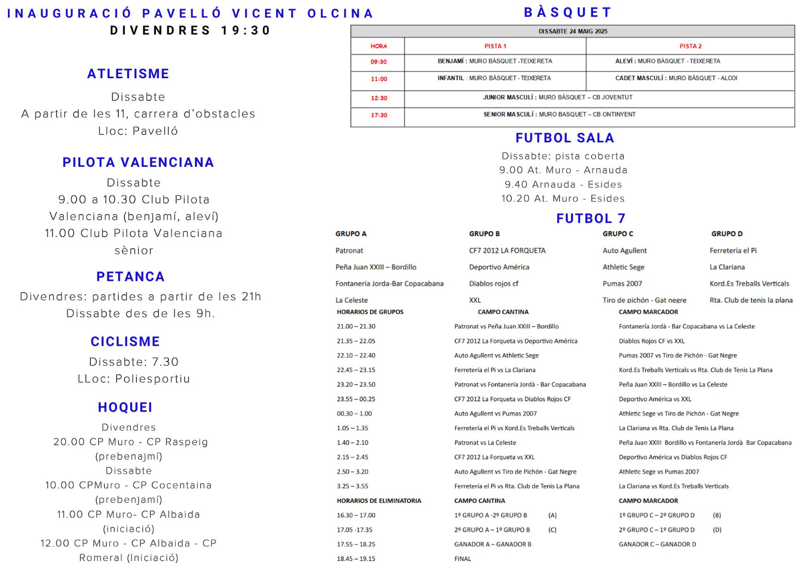 L’agenda de dissabte arrancarà ben prompte, amb proves de ciclisme des de les 7.30 hores al Poliesportiu, i continuarà amb una programació intensa que inclou atletisme amb una carrera d’obstacles al pavelló, partides de pilota valenciana en categories infantils i sènior, així com una completa jornada de futbol 7, amb equips repartits en quatre grups i eliminatòries a la vesprada. A més, els diferents equips del Muro Bàsquet disputaran partits en categories des de benjamí fins a sènior, davant rivals com Teixereta, Alcoi, CB Joventut o CB Ontinyent.
