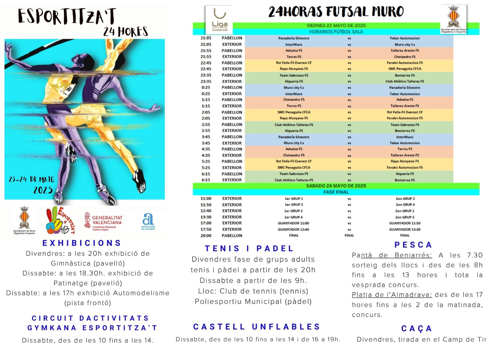 L’agenda de dissabte arrancarà ben prompte, amb proves de ciclisme des de les 7.30 hores al Poliesportiu, i continuarà amb una programació intensa que inclou atletisme amb una carrera d’obstacles al pavelló, partides de pilota valenciana en categories infantils i sènior, així com una completa jornada de futbol 7, amb equips repartits en quatre grups i eliminatòries a la vesprada. A més, els diferents equips del Muro Bàsquet disputaran partits en categories des de benjamí fins a sènior, davant rivals com Teixereta, Alcoi, CB Joventut o CB Ontinyent.