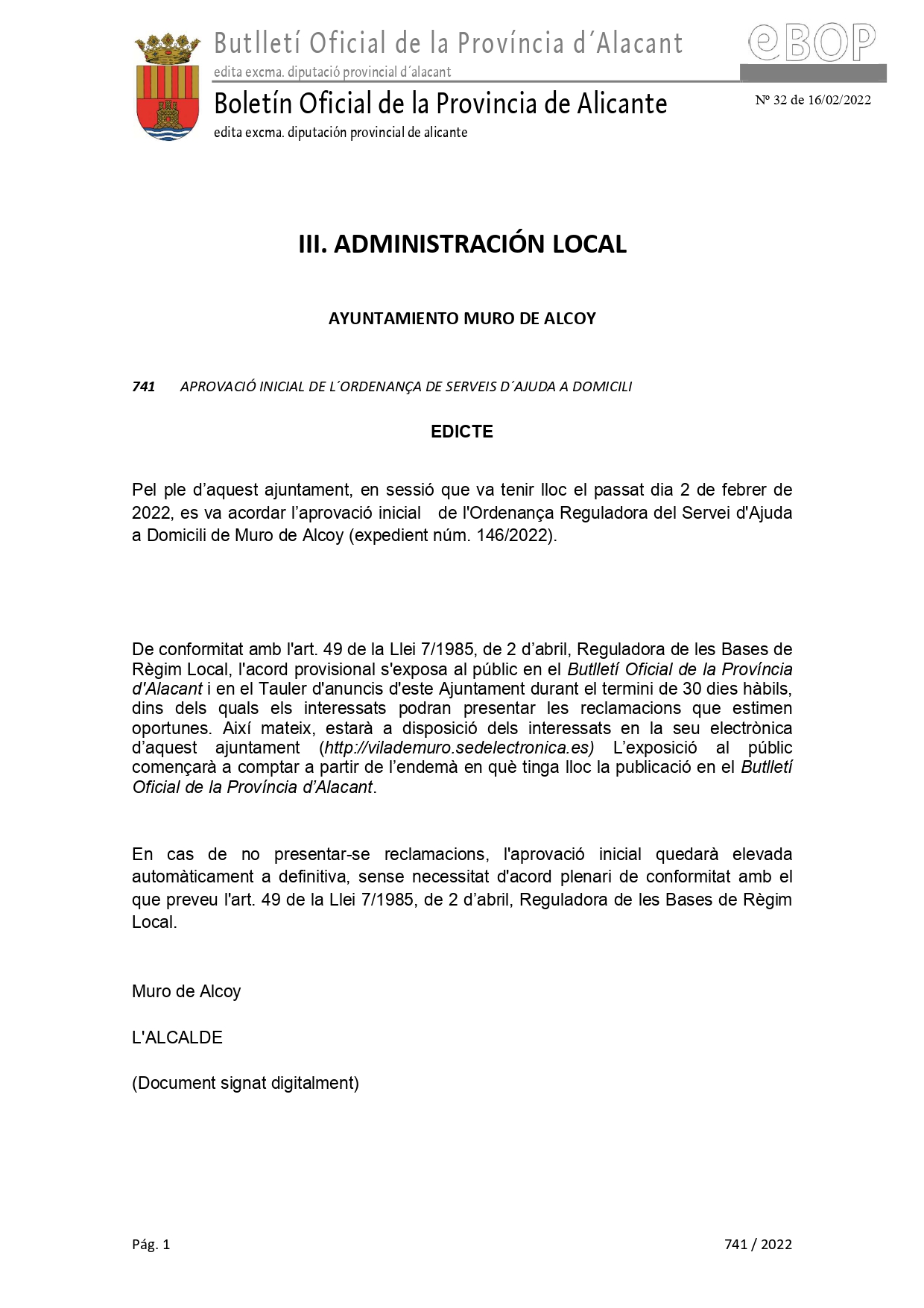 Edicte aprovacio inicial Ordenaça de Servei d’Ajuda a Domicili