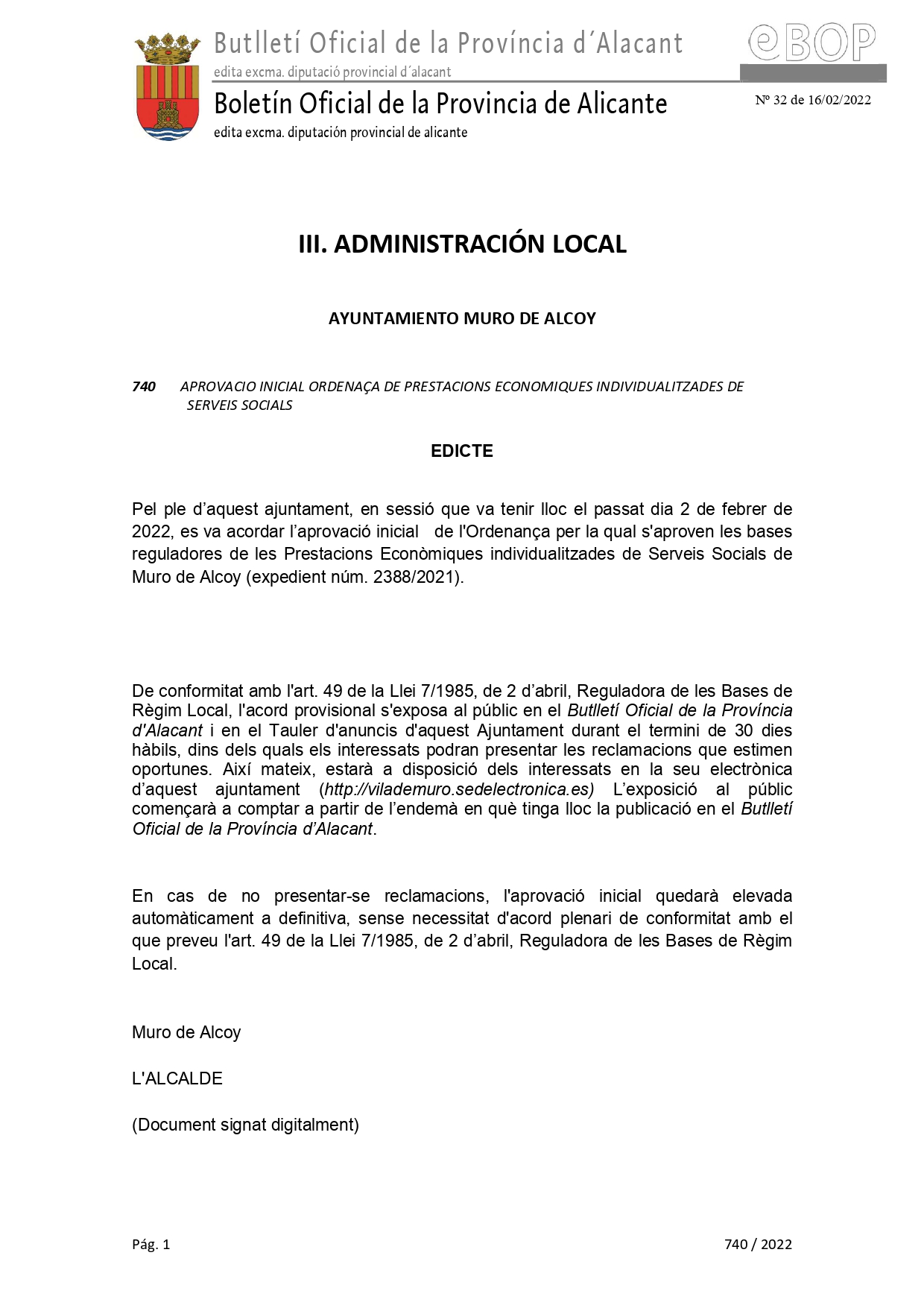 Informació pública de l’aprovació inicial de l’Ordenança per la qual s’aproven les bases reguladores de les Prestacions Econòmiques individualitzades de Serveis Socials de Muro de Alcoy