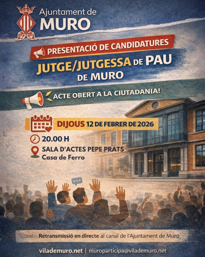 L’Ajuntament de Muro posa en marxa un procés participatiu per a facilitar la participació directa de la ciutadania en l’elecció de la jutgessa o el jutge de Pau del municipi. L’objectiu és reforçar la transparència i la implicació veïnal en una figura clau de la justícia de proximitat, basada en l’escolta, la paraula i la convivència. El procés es desenvoluparà en dos períodes de votació —telemàtic i presencial— i inclou mesures específiques per a garantir la seguretat del vot i la protecció de dades personals (RGPD). En este context, el consistori vol agrair la tasca del jutge de pau que ara finalitza mandat, Alfonso Pascual, “un home bo que ha posat Muro sempre per davant i ha deixat el llistó ben alt”.