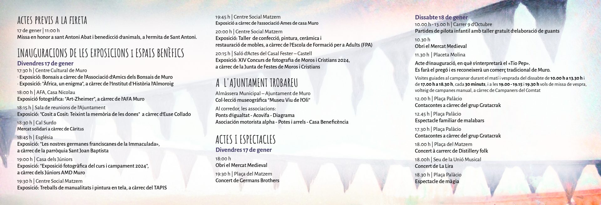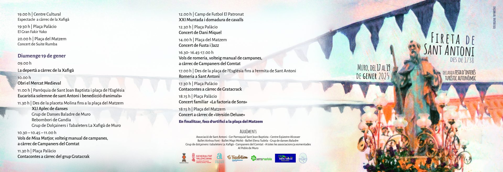 Muro celebra la seua Fireta de Sant Antoni des de 1738 i un any més s’ha proposat ser l’aparador del seu múscul comercial i cultura. D’aquesta manera desenes de punts de venda i una nodrida programació d’actes, per a tots els públics, i exposicions s’han enllestit per