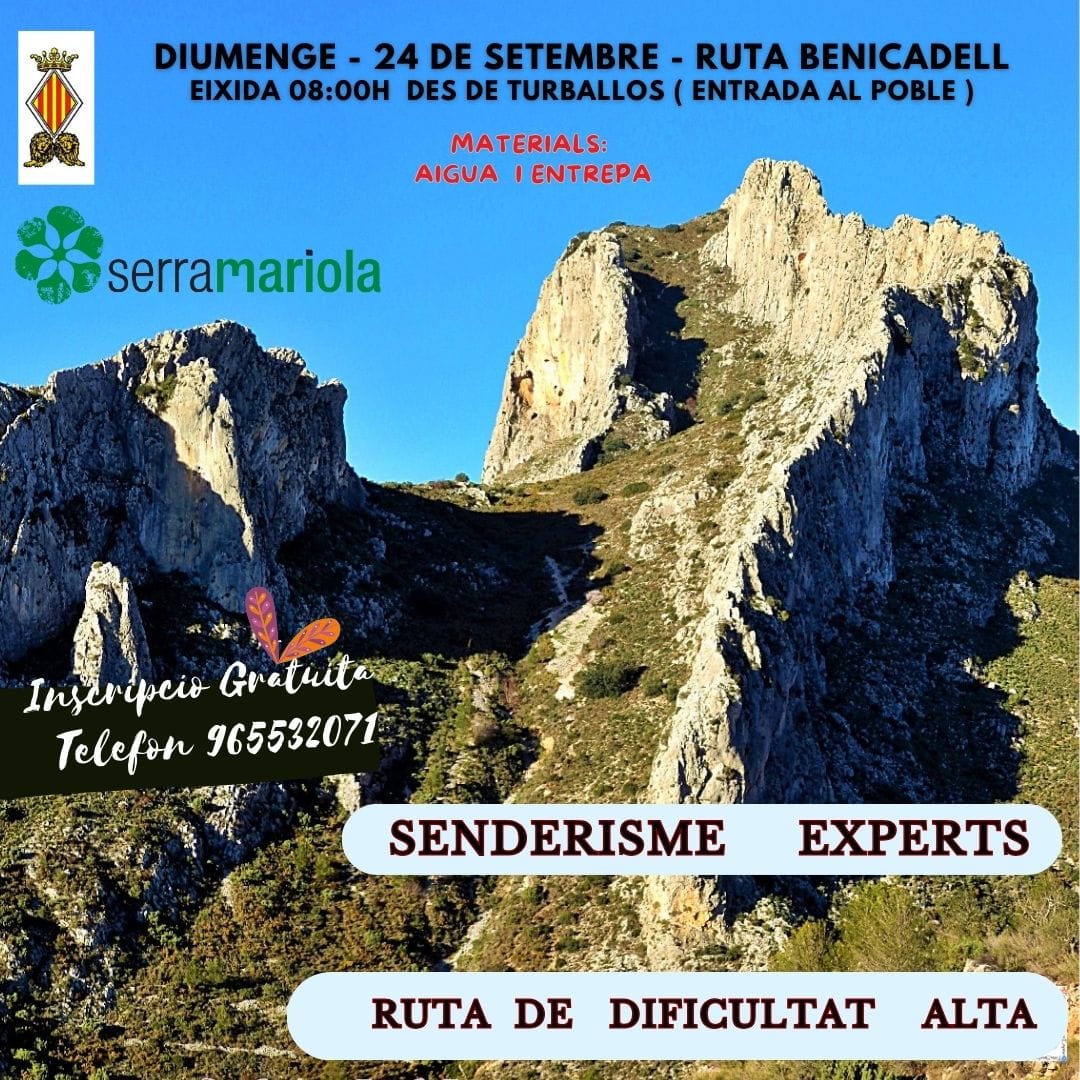 El recorregut passa pel camí d’Almoroig, explanació del ferrocarril de Gandia, Turballos, Camí de Gaianes, la Creu de Gaianes, es puja pel calvari de Gaianes, Ermita de Gaianes, es continua per pista fins a arribar a l’encreuament de la senda on hi ha cartell indicador, es pren una senda direcció a la Coyeta Llarga, punt de referència per on s’ha de passar molt prop, per l’esquerra. Anar pujant a eixir a l’alt on s’albira la província de València, punt de trobada amb PR-Vs que puja dels Fontanars dels Alforins d’Albaida PR-V213.3 i PR-V222, buscar el camí a la dreta de pujada al Benicadell. Passarem per la Cava del Tio Silvestre, després farem una xicoteta baixada a buscar el camí de pujada al Benicadell. Abans de pujar al cim anar amb atenció per haver-hi un pou sense protecció d’uns quatre metres de profunditat al costat de les ruïnes. Passarem per la cresta, tram amb un poc de dificultat. Vistes panoràmiques. Arribant al cim del Benicadell.